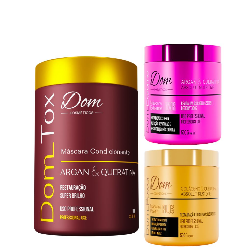 A combinação do Btox Capilar Dom Tox, Máscara Extreme Hair Nutrição e Máscara Power Plus Hidratação da Dom Cosméticos oferece um tratamento completo que promove reconstrução, nutrição e hidratação intensivas para cabelos danificados. Juntos, esses produtos restauram a beleza, força e saúde dos fios, proporcionando um cabelo alinhado, macio e com brilho radiante.