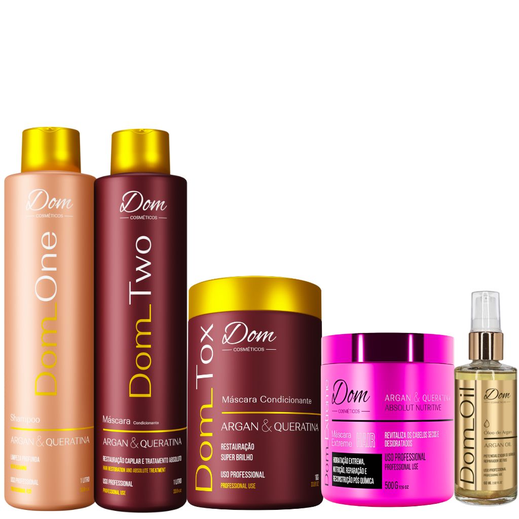 Kit Completo de Tratamento Capilar: Escova Progressiva Dom Two, Btox Dom Tox, Máscara Nutritive e Óleo de Argan Dom